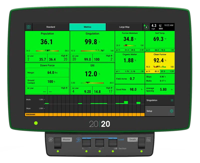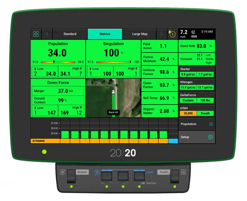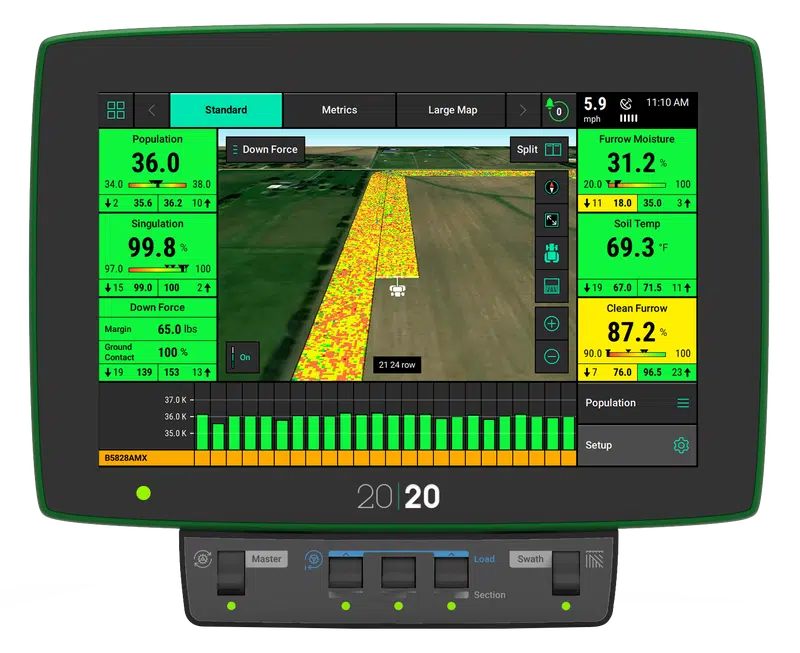 20|20 can be utilized as a monitor to help you simply set the planter to maximize planter performance in each crop, each day of planting. That same 20|20 also powers the most agronomically advanced systems on the market that control population, downforce, liquid, multi-hybrid planting and high-speed planting, all while sensing the furrow.