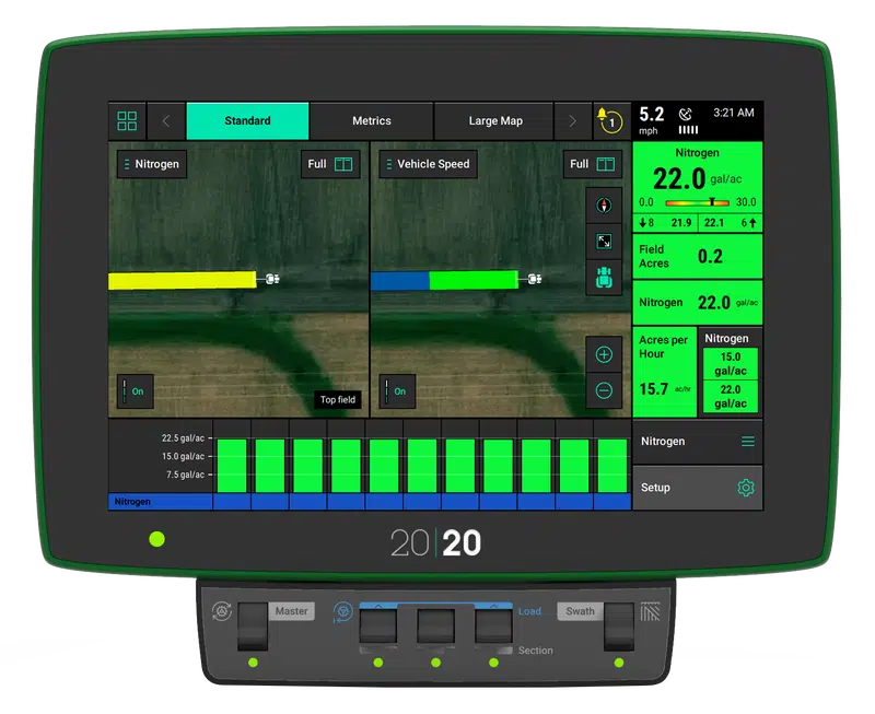 Utilize 20|20 on the sidedress bar to capture rate by row, and pair it with vApplyHD to control the rate on each knife. The same display provides you with the clearest agronomic picture available to take your liquid sidedress pass to the next level with real-time row-by-row rate monitoring and control.